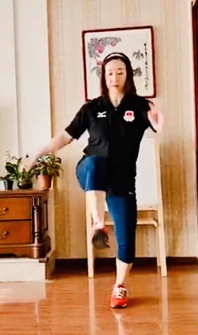 原地进行高抬腿,左手拍左膝盖,右手拍右膝盖,频率根据自己身体情况而定,做两组,每组进行10~20秒,组间10秒。