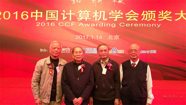 (图4 2017年1月14日,中国计算机学会“中国计算机事业60年杰出贡献特别奖”颁奖现场,(左起)王惠通、苏东庄、杨天行、周锡令先生合影)