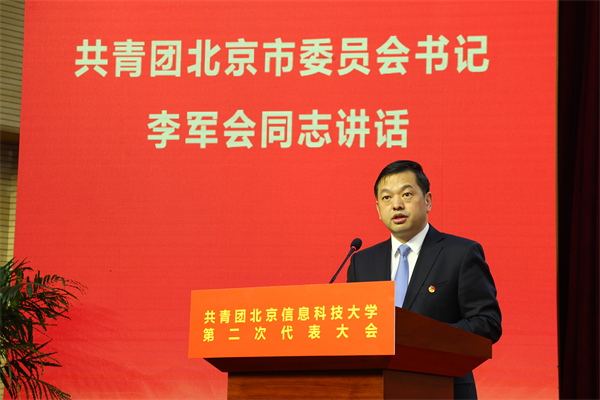 李军会代表北京团市委讲话。他表示,北京信息科技大学大学自建校以来为国家和民族发展作出了突出贡献,在新时代为党做好青年工作积累了很多宝贵经验和做法。李军会充分肯定了我校共青团工作近年来取得的成绩,就我校共青团如何贯彻落实团中央和团市委指示精神提出三点希望:一是要聚焦为党育人主责主业,引导青年坚定不移听党话、跟党走;二是要坚持服务大局与服务青年相统一培养青年全面成长成才、投身强国伟业;三是要树立“大抓基层”鲜明导向,提升团的组织力凝聚力战斗力。