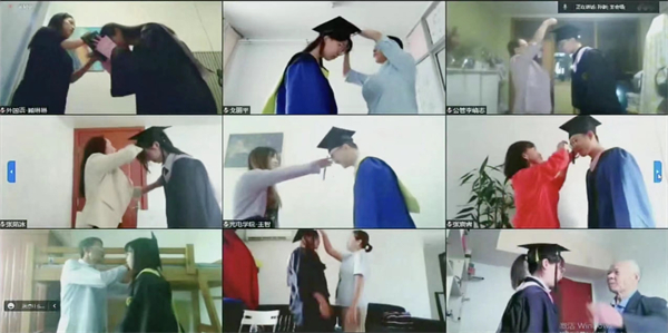 线上参会的家长为身披学位服毕业的孩子拨穗后,深情拥抱,场面十分感人。
