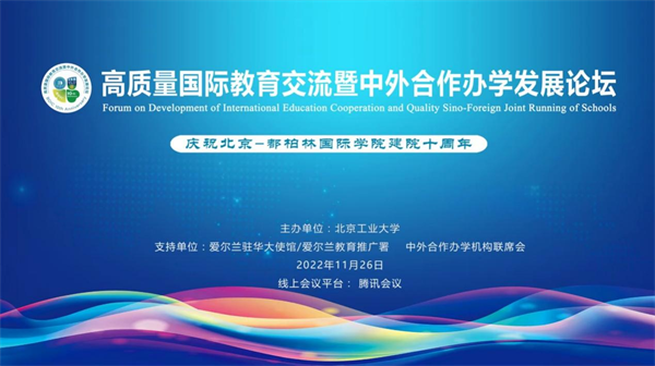 本次论坛由北京工业大学主办,旨在深入学习贯彻党的二十大精神,积极推动国际教育交流和中外合作办学高质量发展,分享高质量中外合作办学发展经验。爱尔兰驻华大使、教育部国际合作与交流司、中国教育国际交流协会、北京市教育委员会、北京市人民政府外事办公室的相关领导及中外高校校长、国际处处长、中外合作办学机构/项目负责人等300余人参加会议。