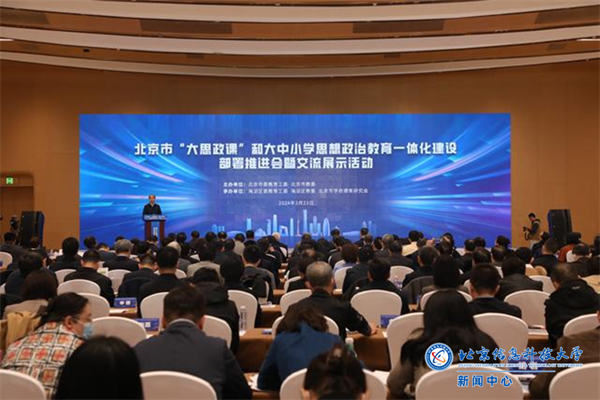 3月23日,北京市“大思政课”和大中小学思想政治教育一体化建设部署推进会暨交流展示活动在中关村论坛永久会址召开。会议旨在以首善标准推进“大思政课”和大中小学思想政治教育一体化建设落地落实,为构建学校思政工作新生态“破题”,为探索教育新质生产力“求解”,为服务教育强国建设“聚力”。北京市委常委、教育工委书记、市政府党组成员于英杰出席会议并致辞,市政府党组成员马骏为北京市大中小学思想政治教育一体化改革创新试验区授牌。我校党委副书记、校长郭福出席活动。